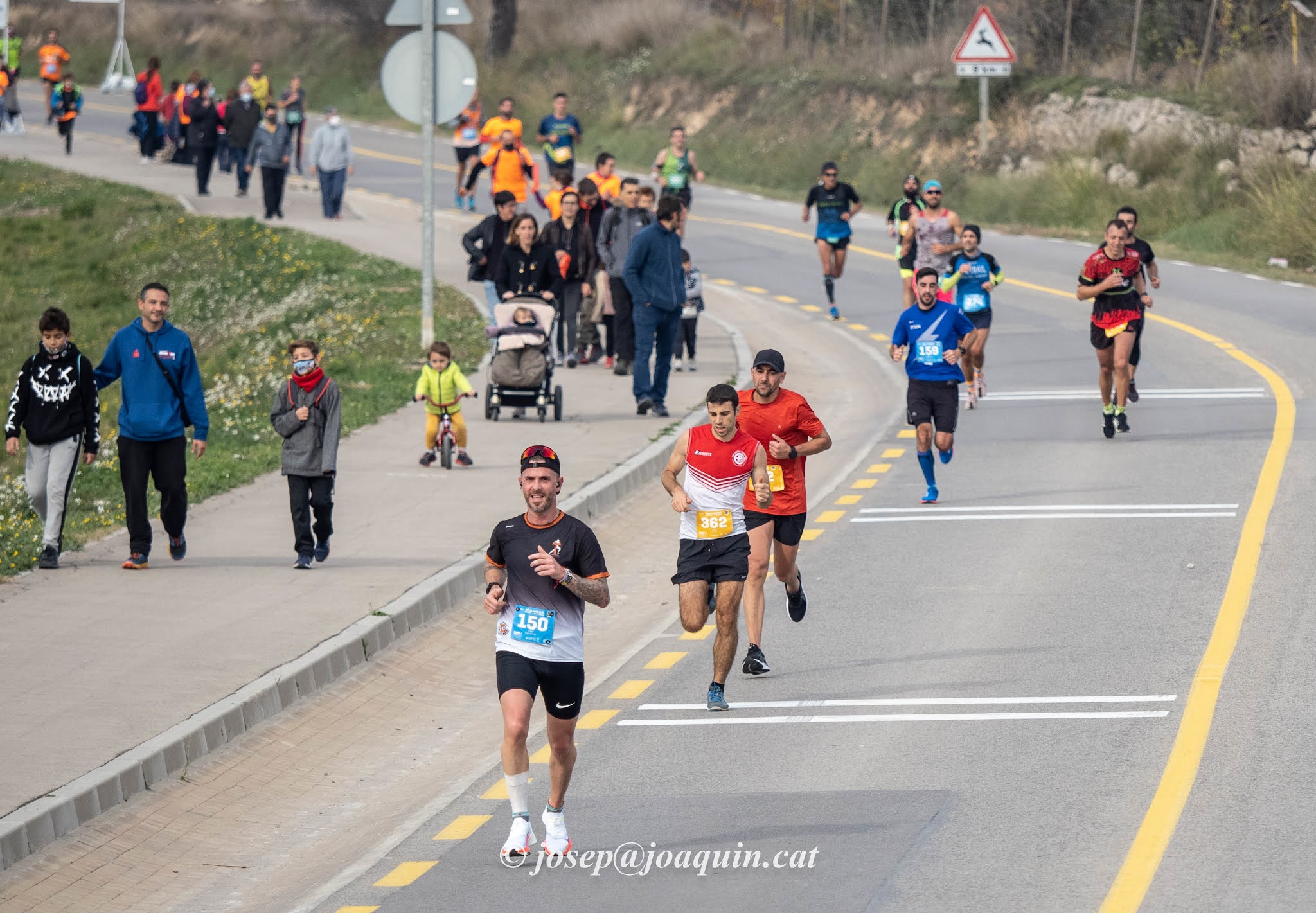 Vamos pasando pueblos (Les Cabanyes y Vilobí del Penedés) y en cada uno de ellos, a parte de avituallamiento, hay muy buen ambiente. Mucha gente, sobre todo niños, la mayoría de ellos enfundados en la camiseta naranja de la Mitja Petita animando a todos los corredores. Y como ya he dicho, tenía ganas de disfrutar, así que me dedico a pedir al público que anime más aún y a chocar las manos con los más pequeños.